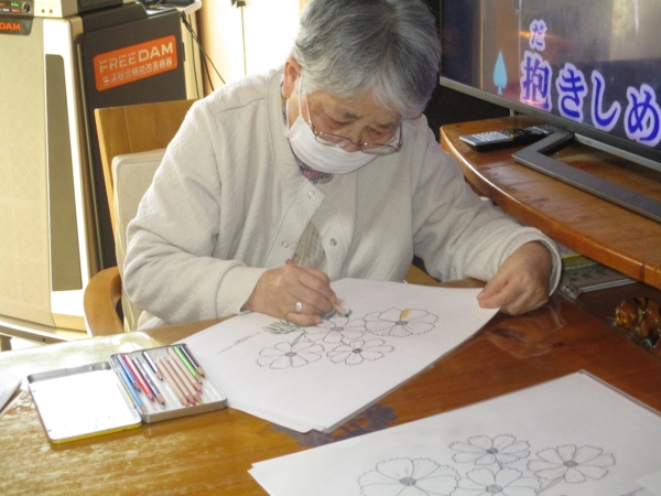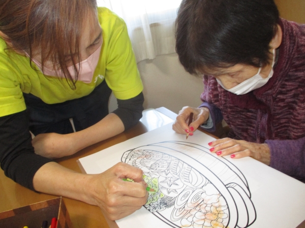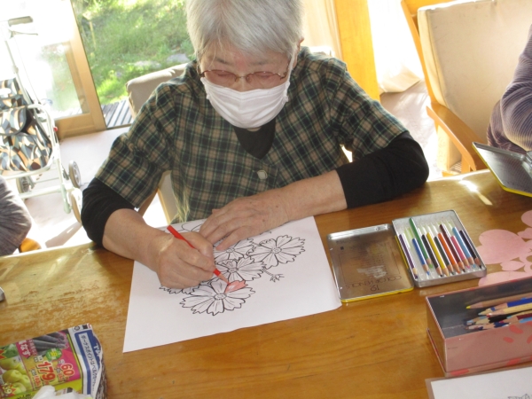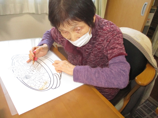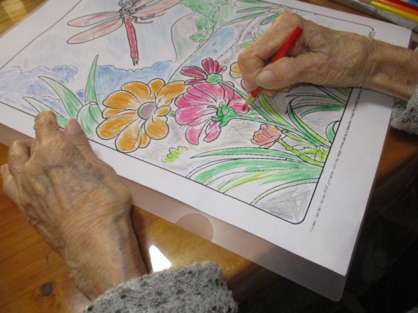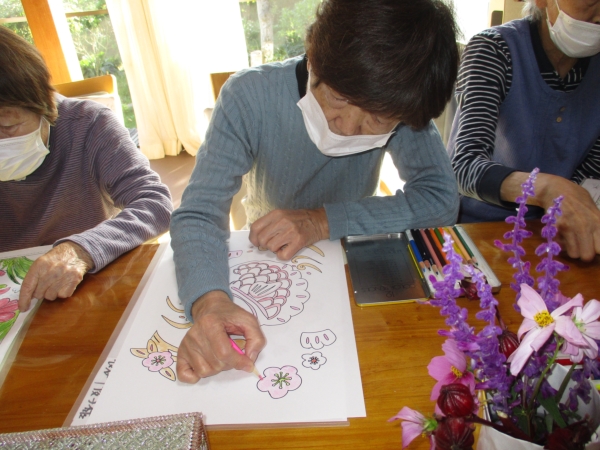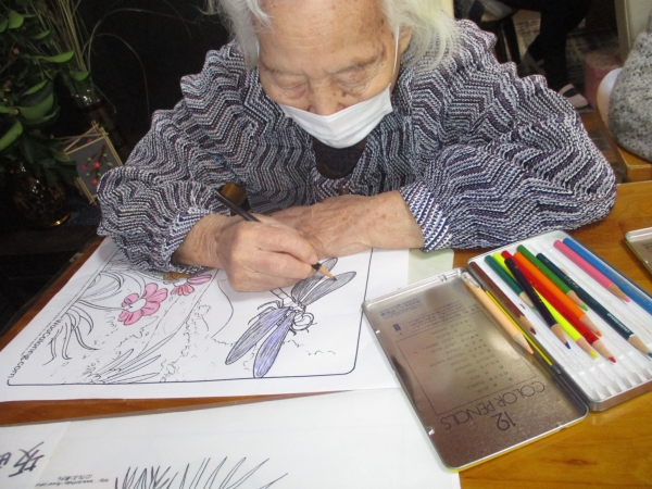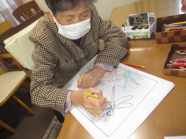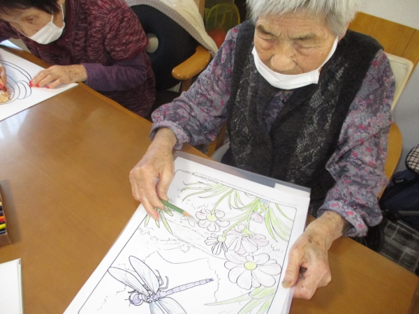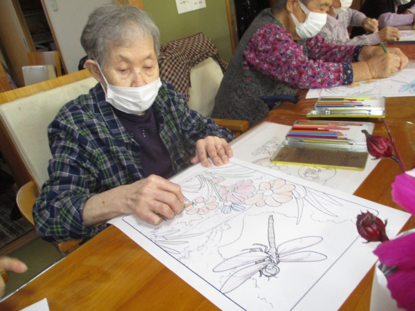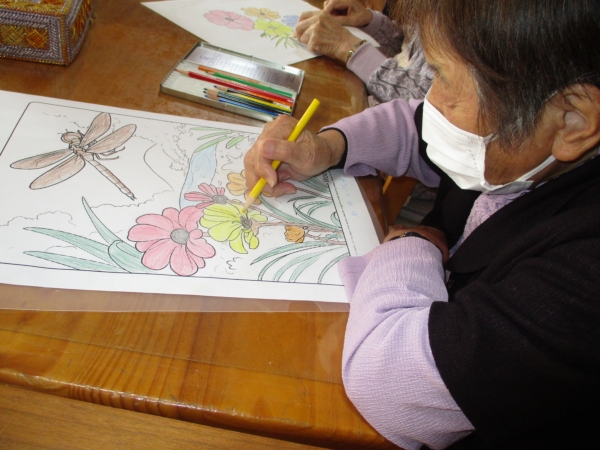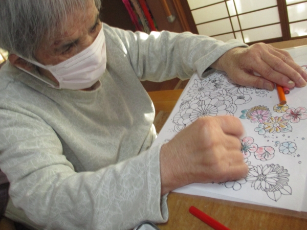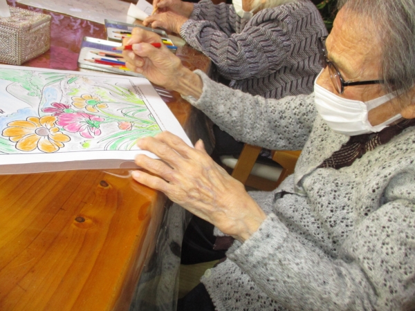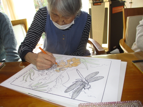 デイルームの中は、塗り絵をしている時にも、昔懐かしい曲が流れています