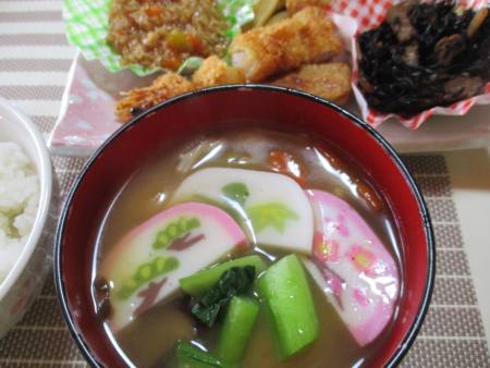 松竹梅のかまぼこがのったすいとんにしてみました(*ノωノ)