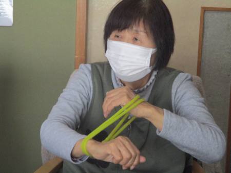 ゴムを二重にして手首にくぐらせ~、「クルクル」