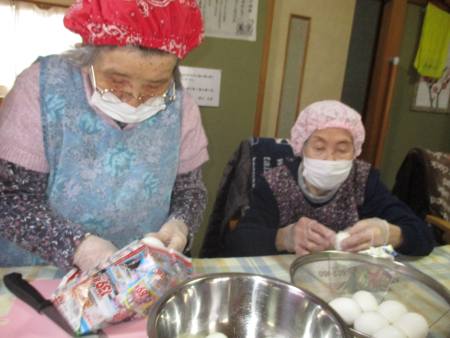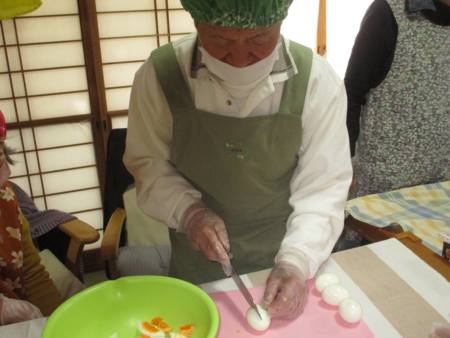 卵の皮を剥く母→卵を切る父…