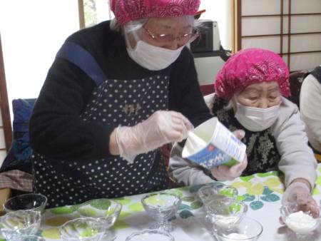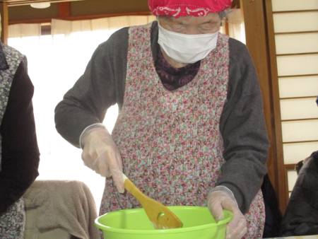 材料に調味料入れて混ぜる母→お皿に盛り付ける