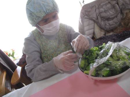 ブロッコリーを割いたり、レタスをちぎったり