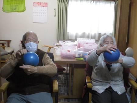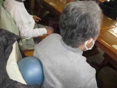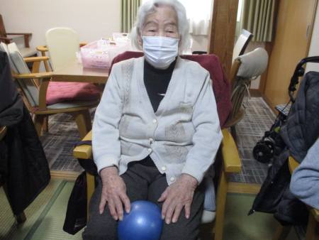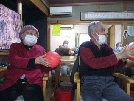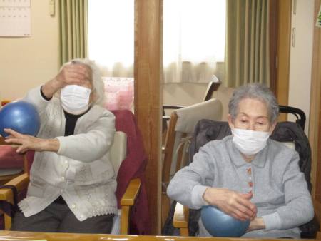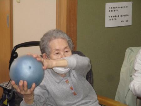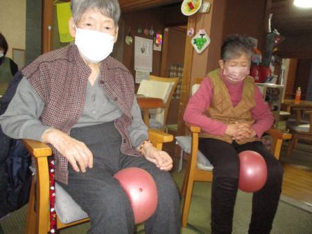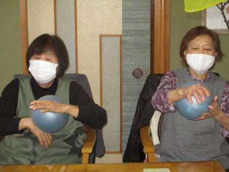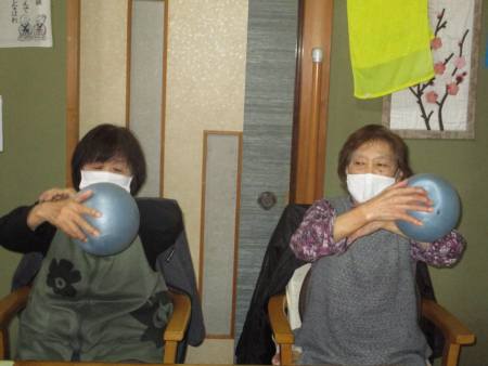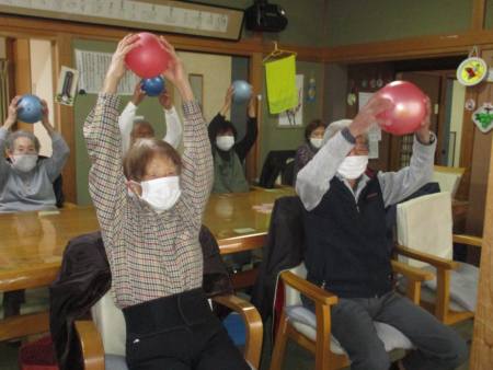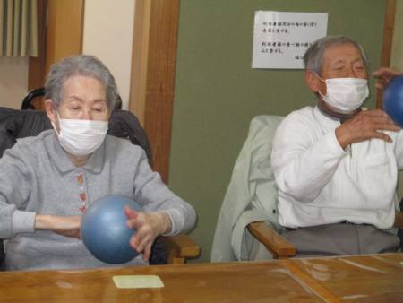 ボール体操は座って行え、上肢・下肢の運動を
