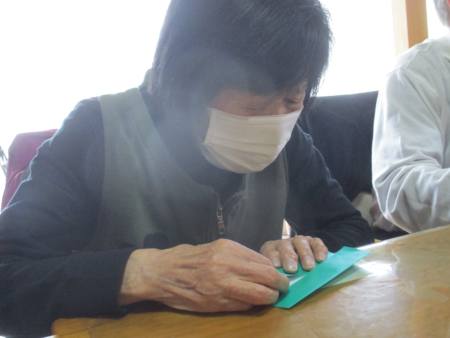 折り紙を半分に折っていきます