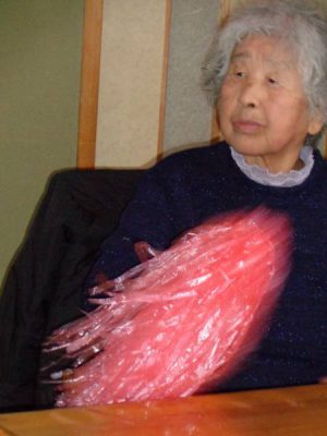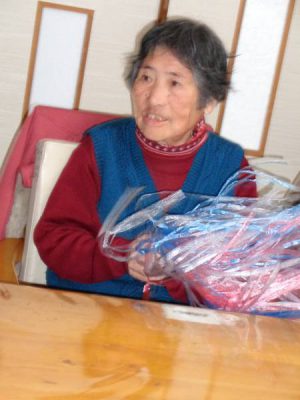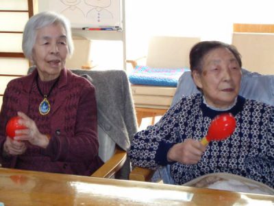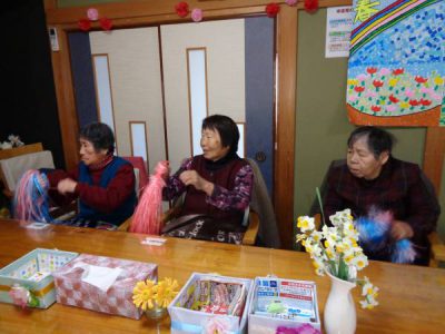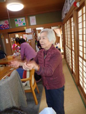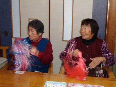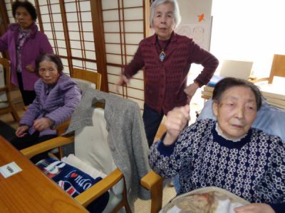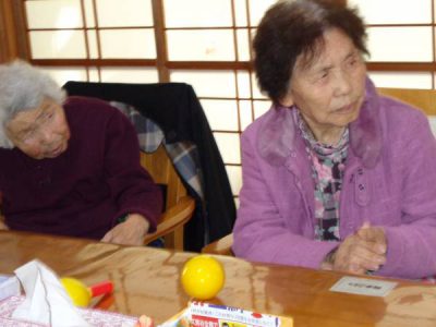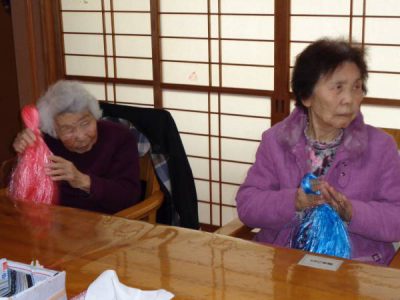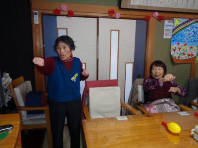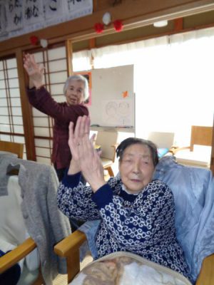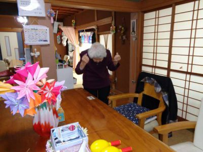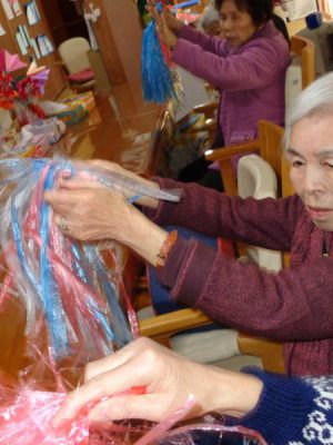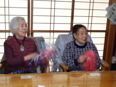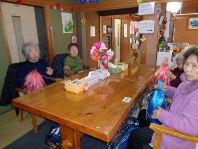 午前レクは、リズム体操で、以前母達が一生懸命作った「ぽんぽん」を使います