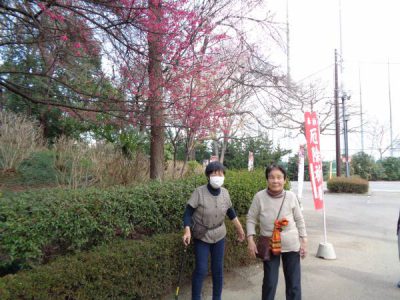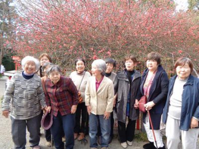 立派なぼけの木の前で集合写真をパチリ