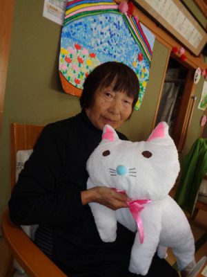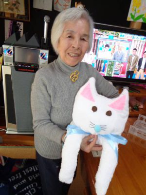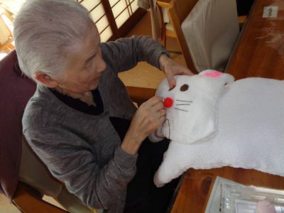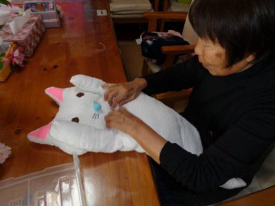 お昼休憩をした後は、レクの前に先日の猫のぬいぐるみ作りの続きを行いました