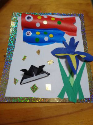 あやめを折りキラキラテ-プで飾れば出来上がり