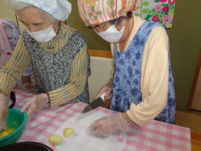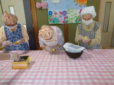 あらかじめ、茹でておいたじゃが芋さんの皮を皆さんに