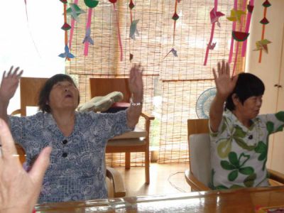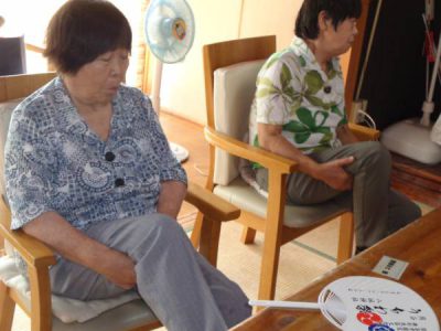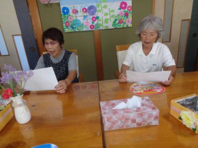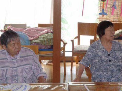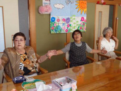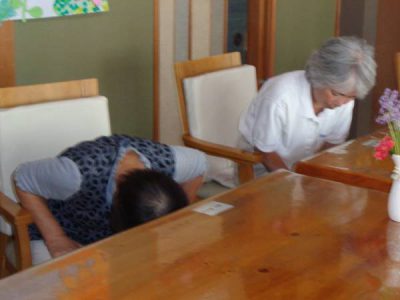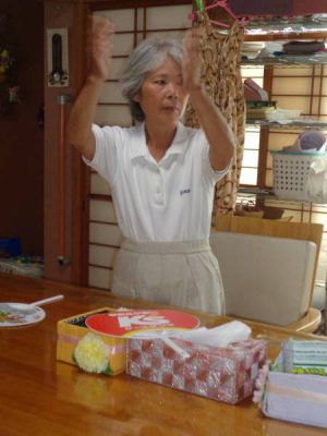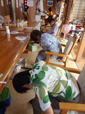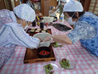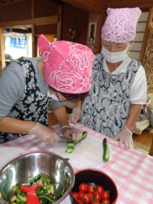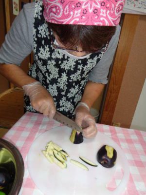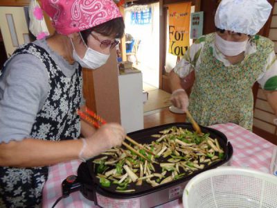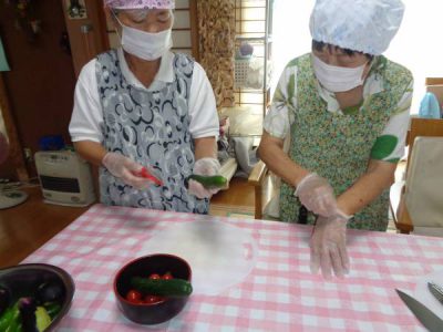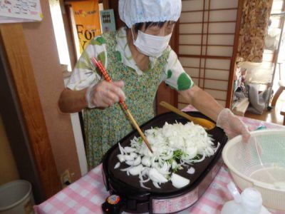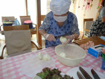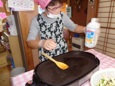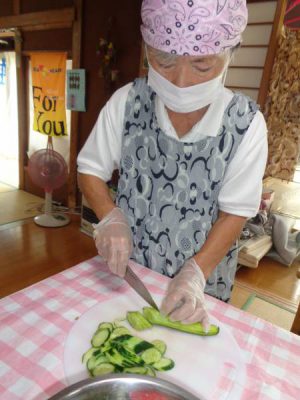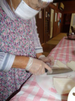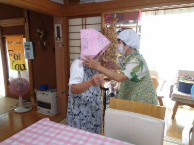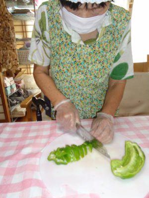 エプロン、ボウシ、グローブ、消毒をしっかり