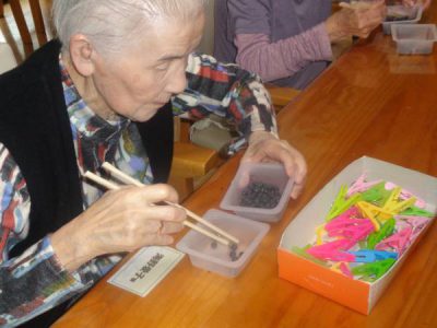 箸で小さい小さいお豆を運びますクリップ指先を使いますよ指でOK