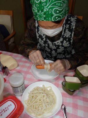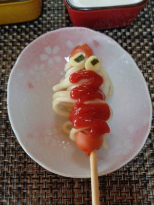 ソーセージにうどんを巻き巻きダイヤダイヤ