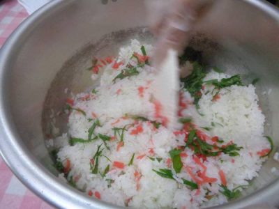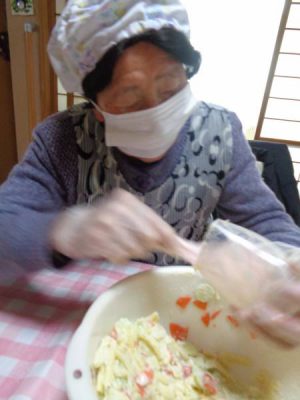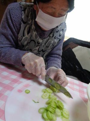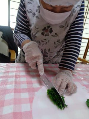 エプロン、三角頭巾、マスク、ゴム手袋を着用後、消毒を
