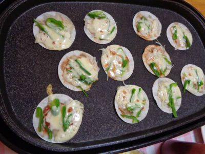 餃子の皮の上に、ピザソースとピーマン、玉ねぎ、とろける