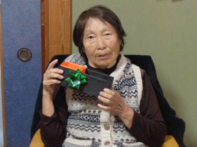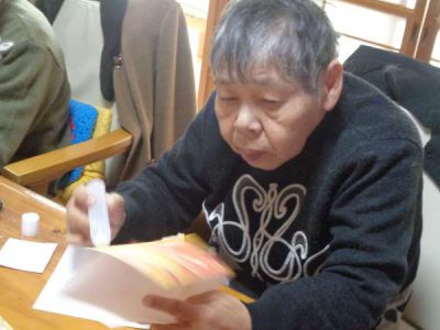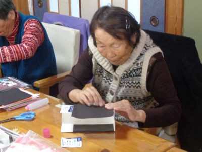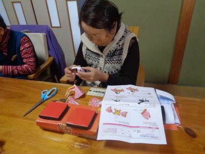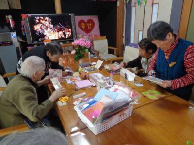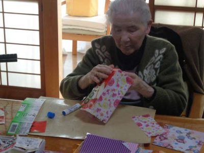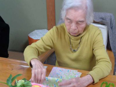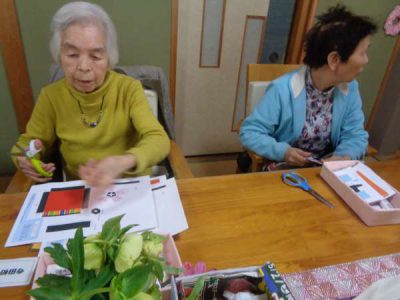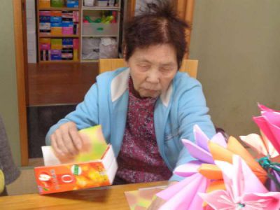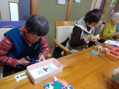 折り紙を丁寧に切ったり、貼ったりしていますよ