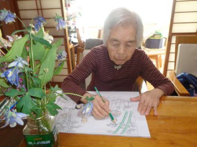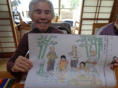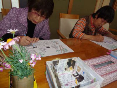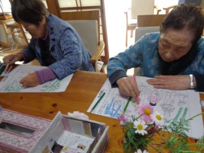 足湯順番待ちの方は、塗り絵を行ってもらいましたわーい (嬉しい顔)