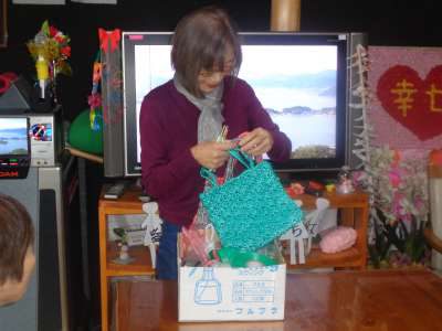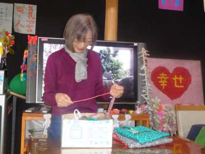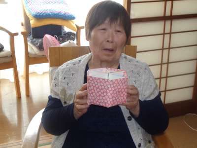 完成した小物入れを持ってもらい、写真撮影です