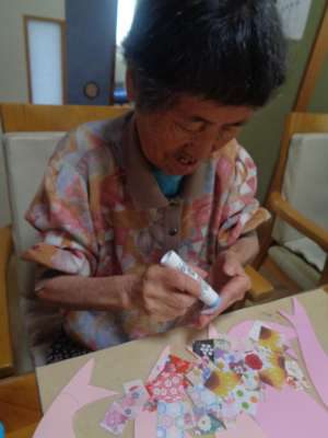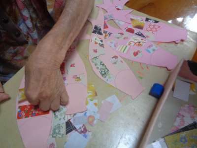 色々な色に折り紙を貼り付けていきます