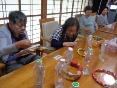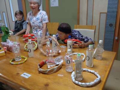 母達、真剣な眼差しで、ペットボトル目掛けてなげます