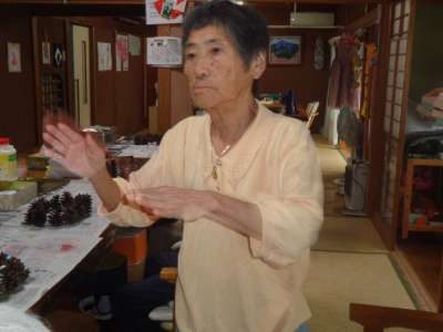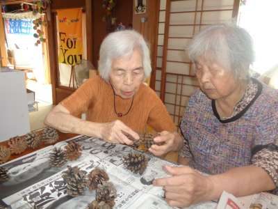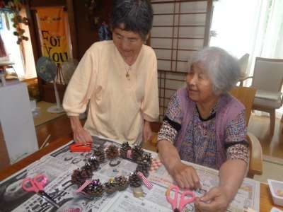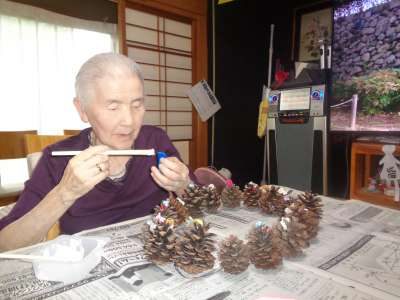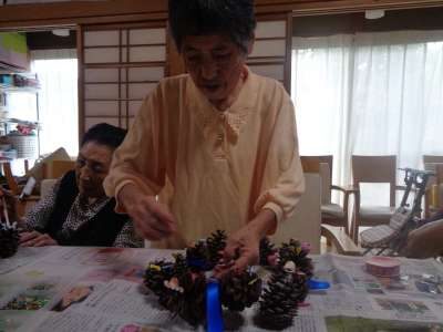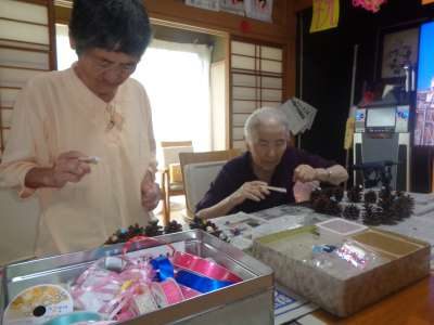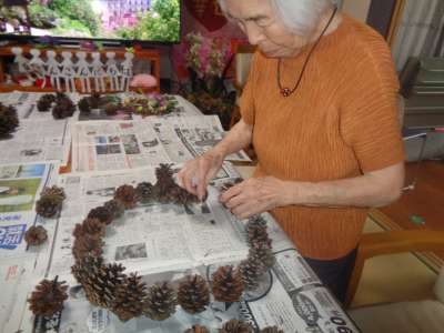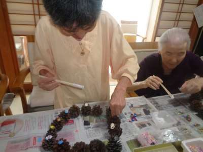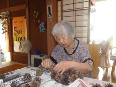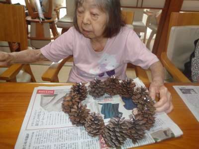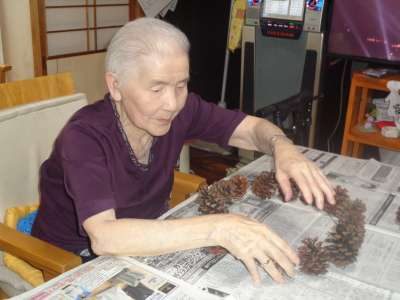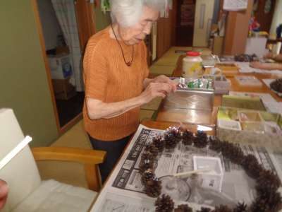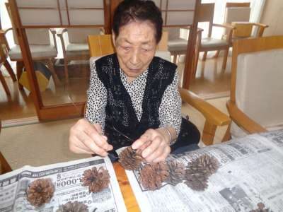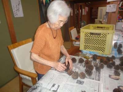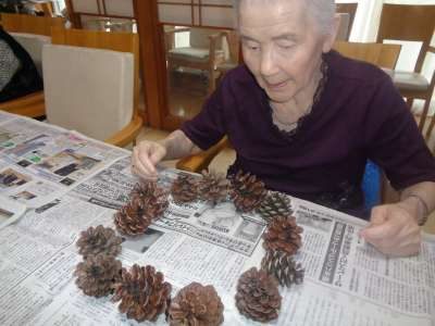 母はワイヤーに松ぼっくりを通し始めました