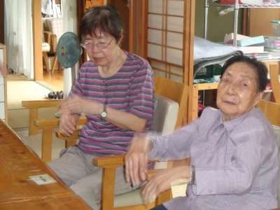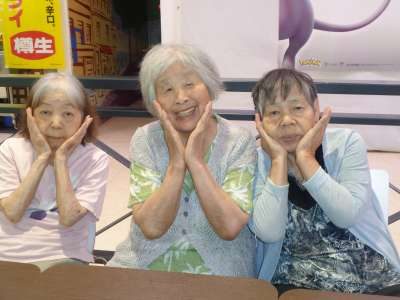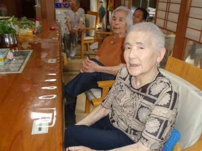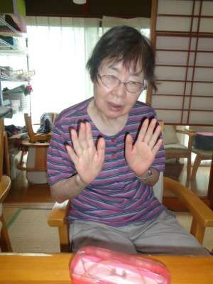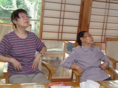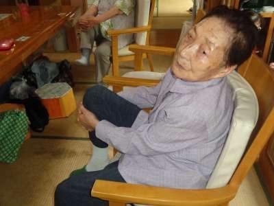 幸せ最長老も元気よく、足を抱えて運動をします