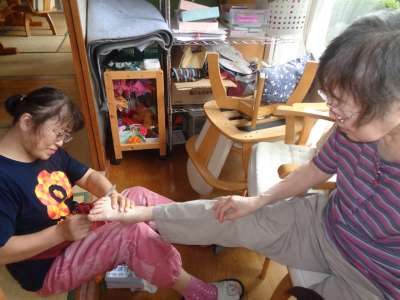 こちらは、足の裏に出来たマメの手入れをしています