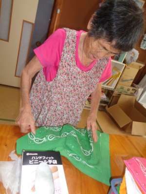 次に、三角頭巾、マスク、ゴム手袋をしっかりと着用