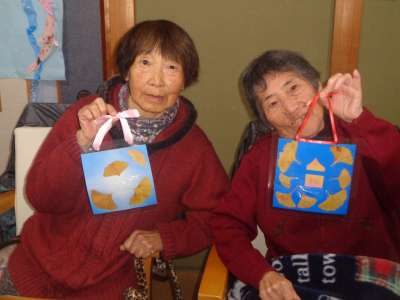 折り紙に銀杏の葉っぱを貼り