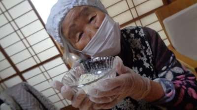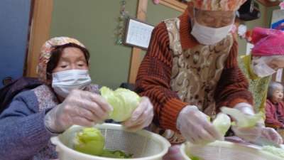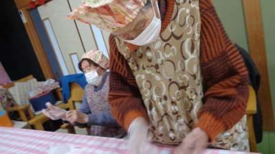 エプロン、三角頭巾、マスク、手袋を着用した後、