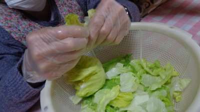 レタスは、手で細かくちぎっていきます