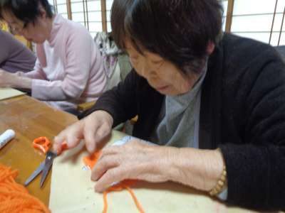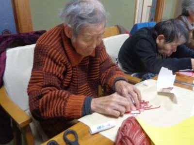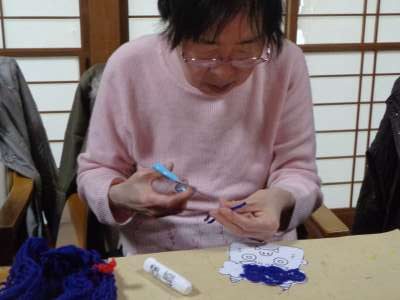好きな色の毛糸を使ってもらい、毛糸を糊で貼りつけて
