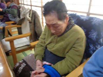 母が夜なべして子供達の手袋を編んでくれる