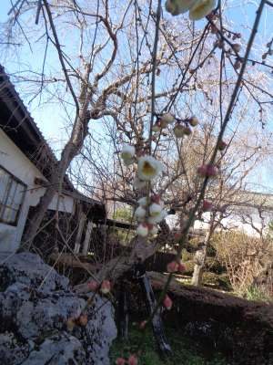幸せの幸望庵の庭に2本の梅の木に梅の花が咲いて来ました
