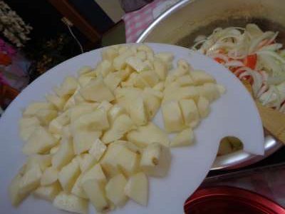 まな板いっぱいにカットしたじゃがいもを入れていきます