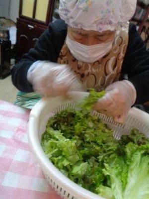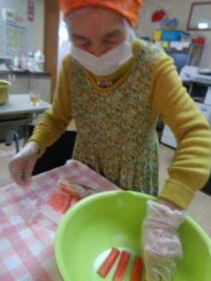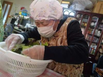 エプロン、三角頭巾、マスク、手袋を着用後、