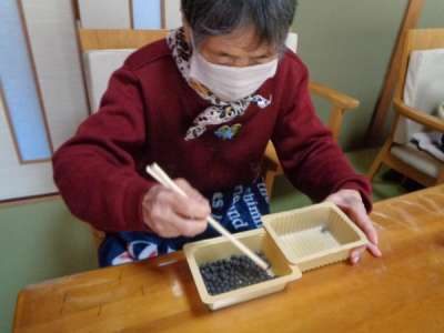 豆つかみゲームで豆をつかむには、箸を上手に使わなけ