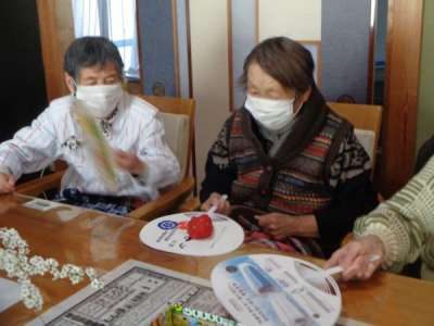 うちわにお手玉を数個乗せて、お隣さんへ渡すひらめき