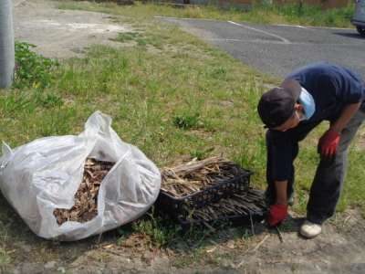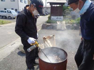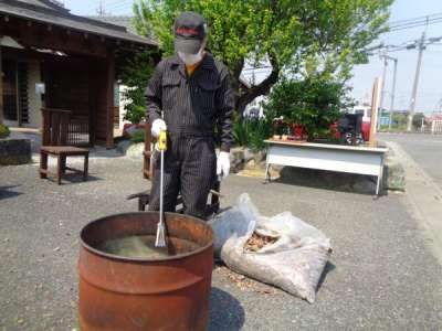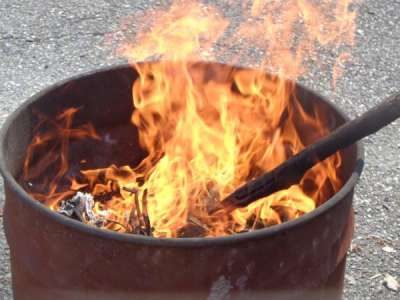 木のくずが入ったドラム缶で火おこし