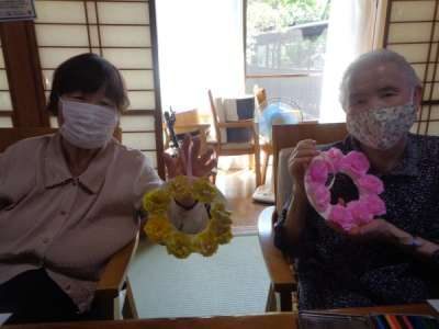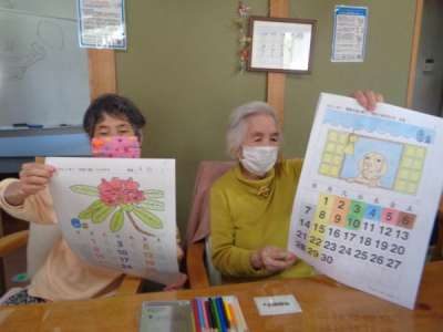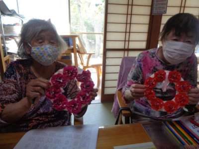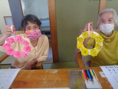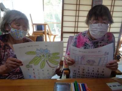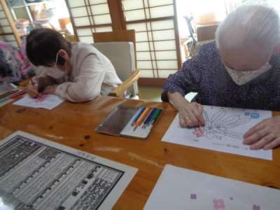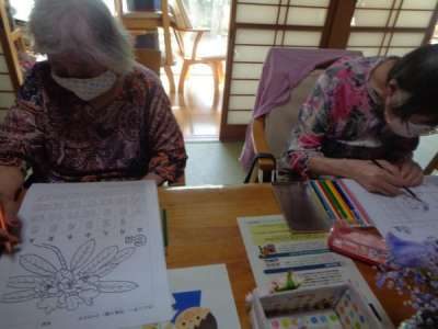 午後はカ-ネ-ションの仕上げと塗り絵に挑戦手 (チョキ)