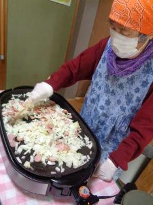 カットした食材を、ホットプレートで炒めていきますわーい (嬉しい顔)