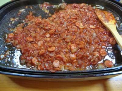 炒めた野菜とハムに、ケチャップソースをかけますうれしい顔