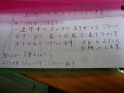 ( 連休中のオープンありがとうございます。)
