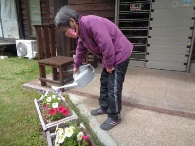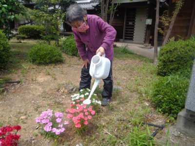 母は、お花の水やりを機能訓練の一環として行っています手 (グー)