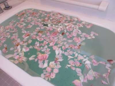 本日のお風呂は、バラの花びらを浴槽に入れた