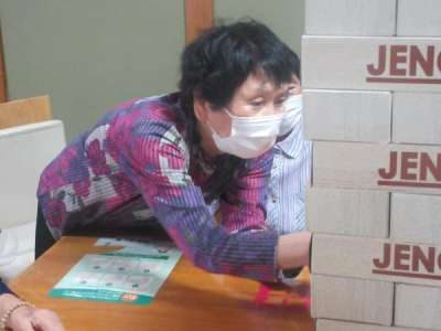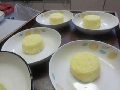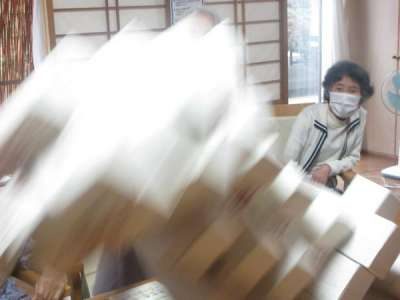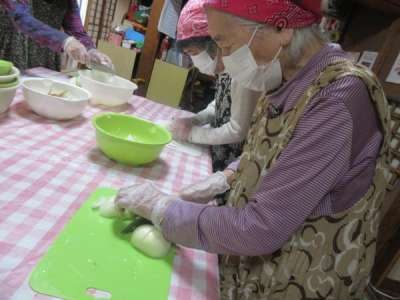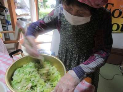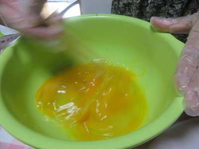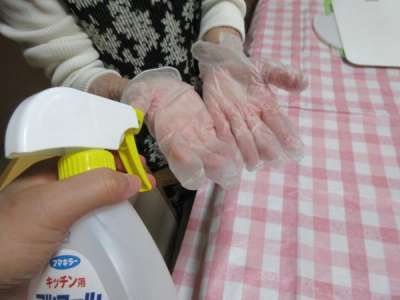 手洗いを済ませた後、エプロン、三角頭巾、ゴム手袋を