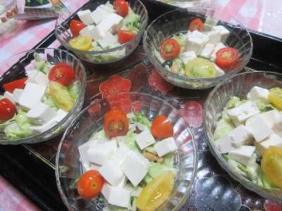 サラダにトマトを綺麗に盛り付けて、サラダ完成です