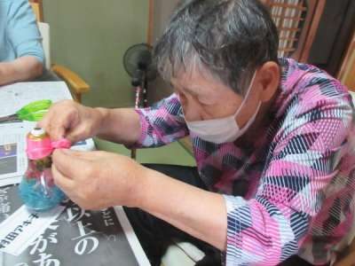 ガラスの瓶にハーバリウム専用オイルをゆっくりと入れて、