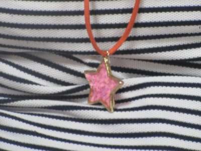 カラフルな手芸ヒモを通し、ペンダントを仕上げて