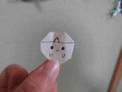 折った折り紙にボールペンなどでゆうれいの顔を描いて