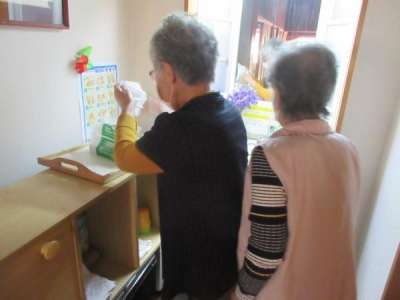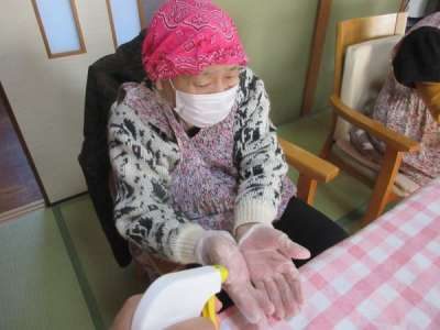 エプロン、三角頭巾、ゴム手袋を着用していきます